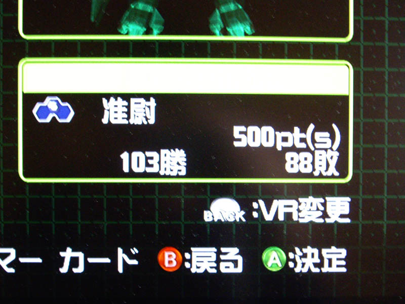 HDDに付いてたゴールドメンバーシップで、本タグをゴールドにしたので、乗機をライデンからサイファーに変更。ただ、始めたのが平日の日中だったせいか、いきなり負けまくった。これがなければ今頃勝率五分くらいだろうに。しかし、負け越しが多い相手とやると結構勝てたりするので、初心者いじめをしている気もしないでもない。