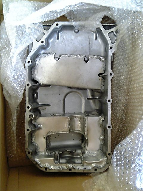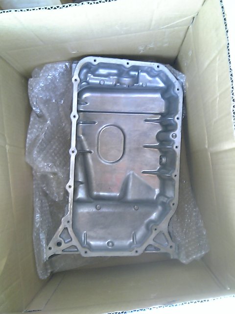 純正オイルパン。右の対策オイルパンとの差は歴然。現時点でエンジンにダメージいってなければいいんだけど。写真の天地が逆だね。