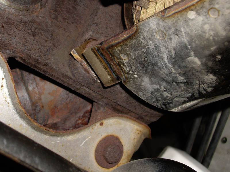 ちょっと前から、アクセルを開けるとやたらと金属の干渉音がして気になっていたので、久々に潜ってみたら、以前に干渉を確認していた遮熱板?の二つあるステーのうち片側がもげていて、もう片方もクラックが入って風前の灯火だったのでむしり取った。